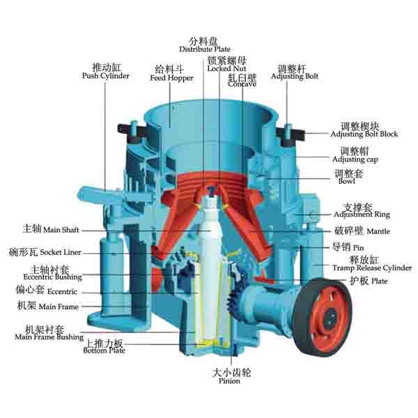 When the movable inner cone gets close to the fixed outer cone, the ores between them will be crushed. When the movable inner cone is away from the fixed outer cone, the crushed ores will be discharged because of its own gravity. When the material that cannot be crushed falls into the crushing cavity, the single cylinder hydraulic at the bottom will control the movable inner cone to fall, by which the discharge outlet can be adjusted and the blocked ore can be discharged.